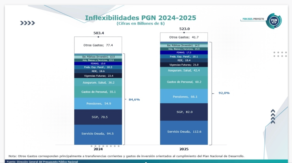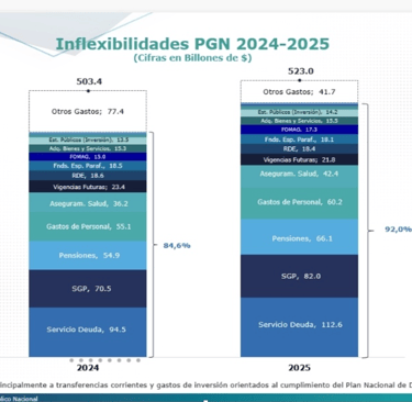 Pero muchos se estarán preguntando ¿Por qué no reducir los gastos en vez de aumentar la deuda violando la regla fiscal? Y es que aquí aparece uno de los problemas estructurales de las finanzas públicas: el gasto fijo e inamovible del Gobierno Nacional. Como ven en la tabla del PGN 2025, el 92% del gasto del Gobierno Nacional no depende del Gobierno Nacional sino de un marco normativo.